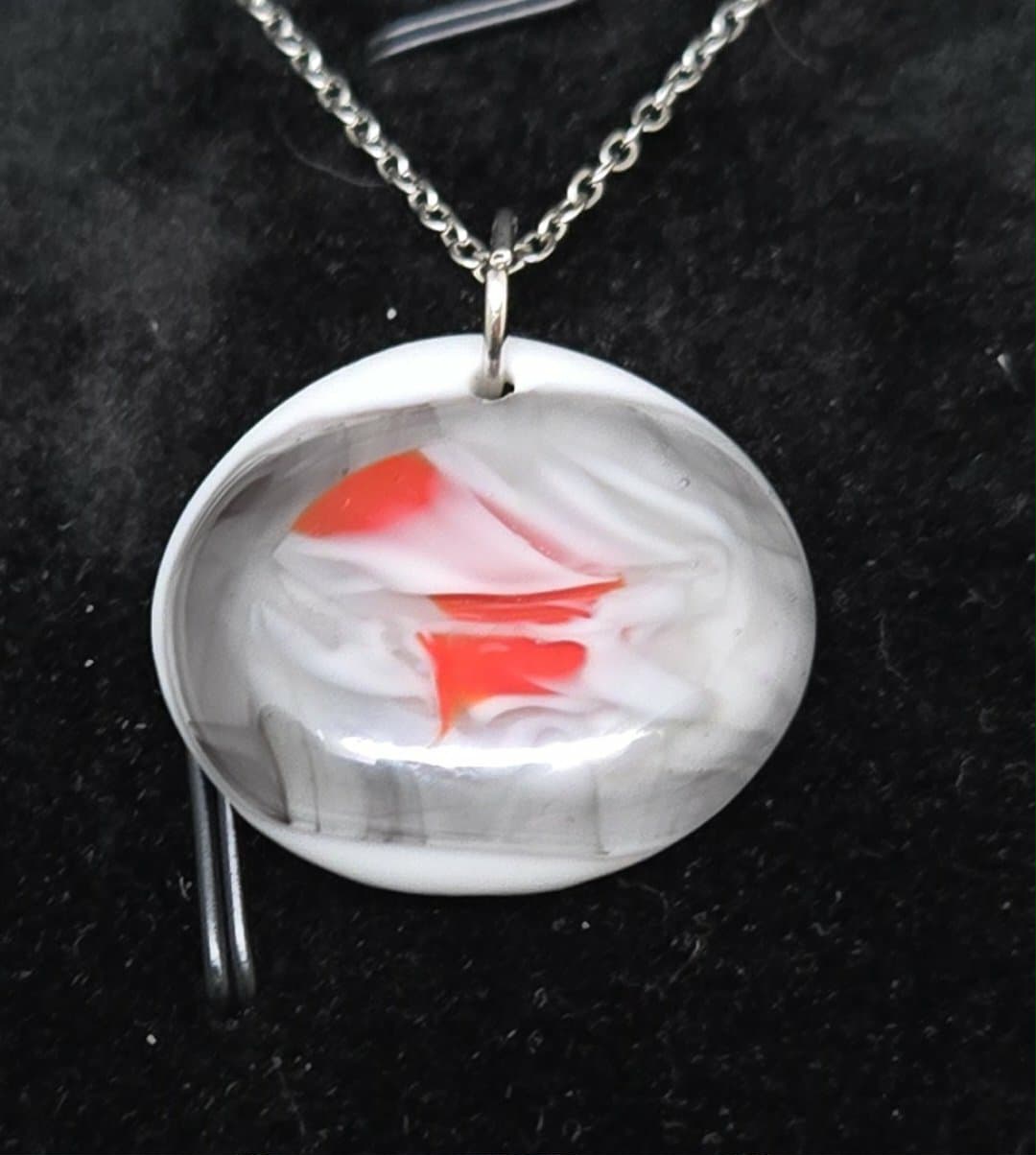 This one-of-a-kind fused glass pendant features a smooth oval form with drifting white and gray tones that look like rising smoke suspended in clear glass. At the center, a bold ember-red flicker breaks through the haze—small, intense, and impossible to ignore. The result is quietly powerful, like a spark that refuses to fade. Subtle enough for everyday wear, striking enough to stand out without effort. Approximate size: about 1 inch. Approximate weight: about 0.35–0.40 oz.