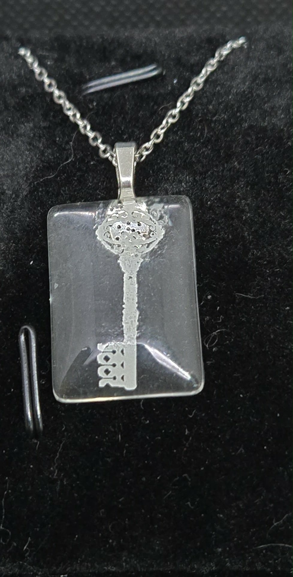 This handmade fused glass pendant holds a tiny vintage-style key, sealed beneath clear glass as if kept safe by quiet magic. The fusible decal key is permanently bonded during kiln firing, giving it a soft, floating appearance—like something found in a story just before the page turns. The petite rectangular glass rounds into smooth edges with a gentle shine, small enough to feel intimate, yet carrying the suggestion that it belongs to somewhere just out of sight. Approximate size: about 1 x 0.5 inches. Approximate weight: about 0.30 oz.