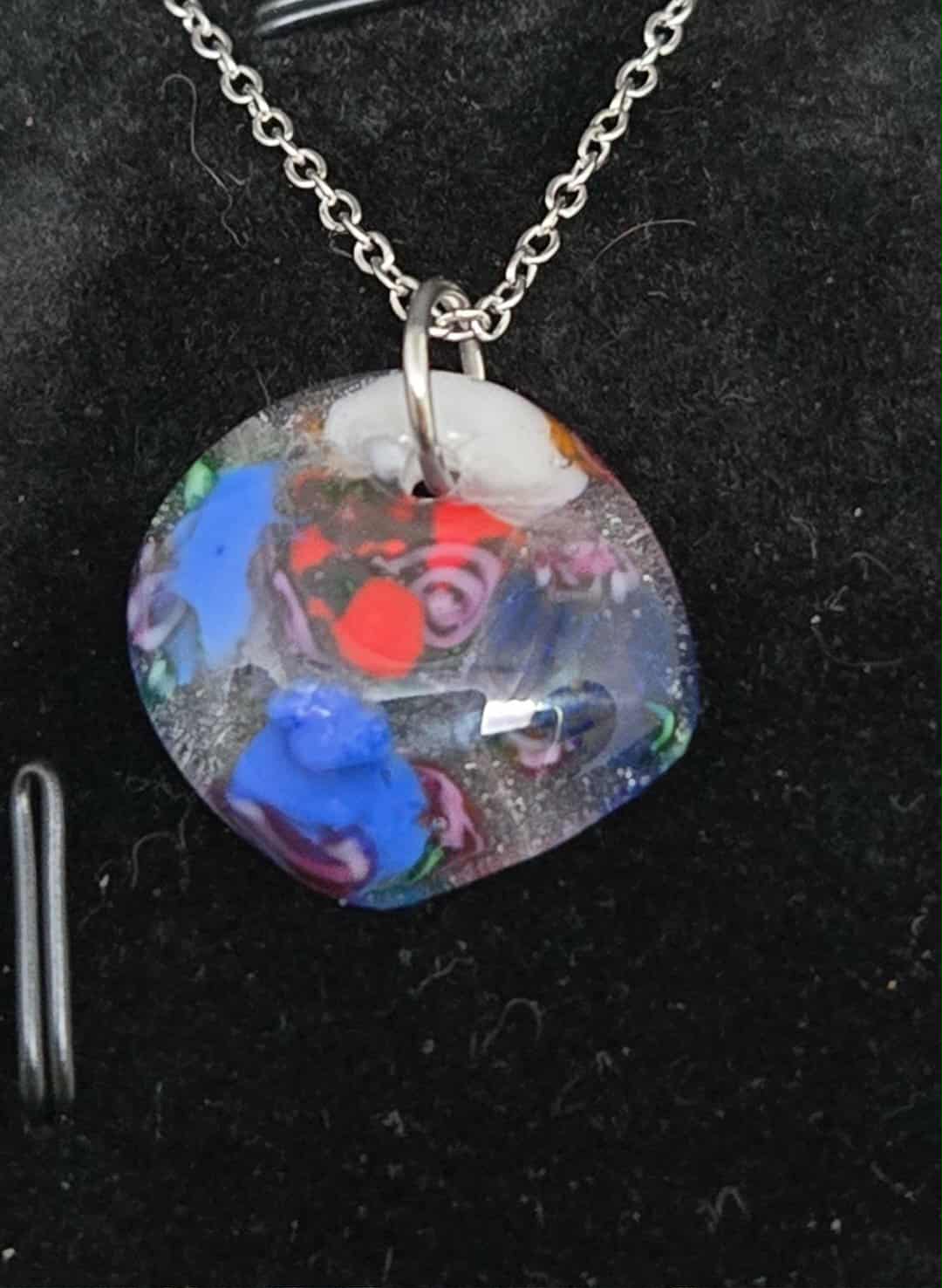 This one-of-a-kind fused glass pendant features an organic clear form scattered with vivid fragments of color—scarlet, cobalt, violet, and soft white suspended beneath the surface like strokes of paint frozen in air. Every angle reveals something different, giving it a lively, enchanted energy without ever feeling loud. It’s the kind of piece that looks unmistakably unique—playful, artistic, and boldly wearable. Approximate size: about 1 inch. Approximate weight: about 0.35–0.40 oz.